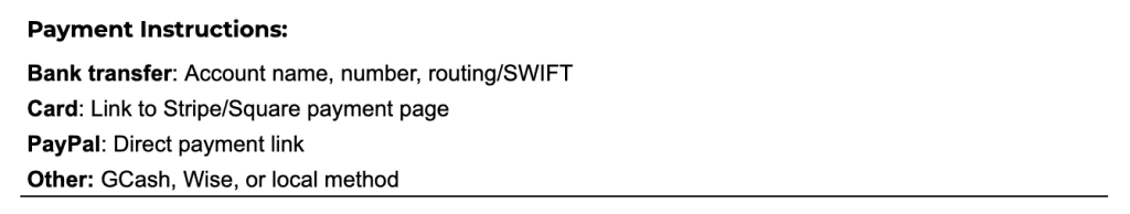Payment due date – Net 7, Net 14, or “Due on receipt” for faster turnaround.