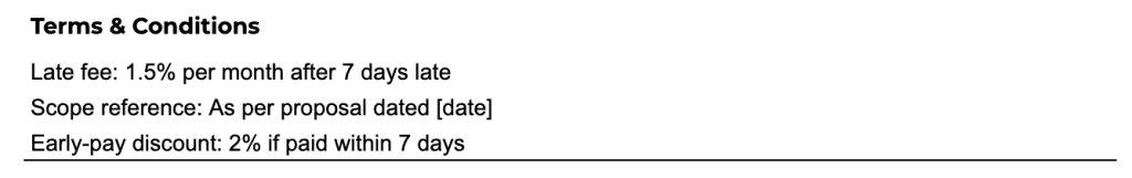 Late fee: e.g., “1.5% per month after 7 days late” (if allowed in your region).
