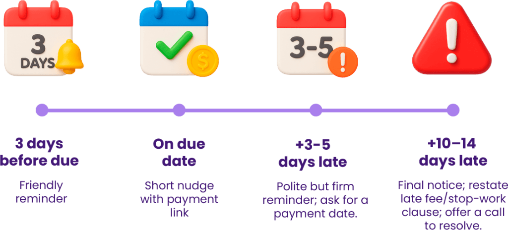 +3–5 days late: Polite but firm reminder; ask for a payment date.